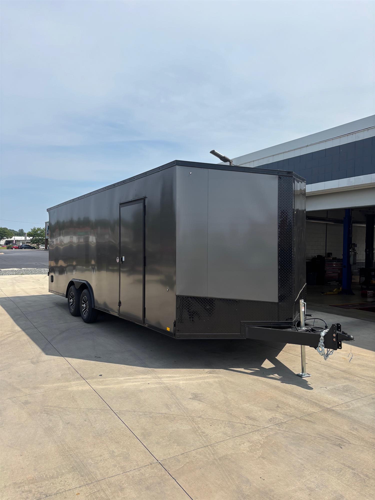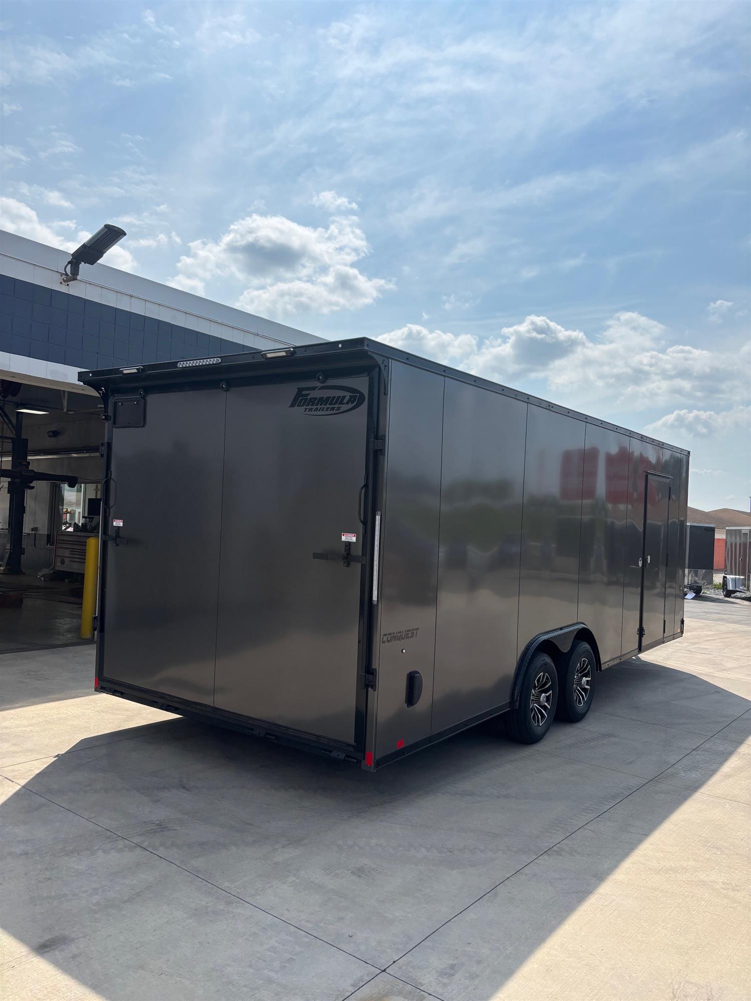 This 8.5'x22' Formula Conquest Car Hauler trailer has an upgraded 7' interior height, 30" slanted v-nose, 16" on-center floor, wall, and roof crossmembers, tandem 5000 lb drop spring axels with EZ-lube hubs, upgraded black aluminum wheel assembly package, a screwless .030 exterior for a clean appearance, flow-thru side vents, LED clearance and tail lights, rear ramp door with fold-out flap, 3/8" DryMax walls, 36" side door with flush mount latch and lock assembly, four welded 5000lb D-rings, upgraded rear flare with two exterior LED loading lights, Interior LED dome light with wall switch, AND much more!